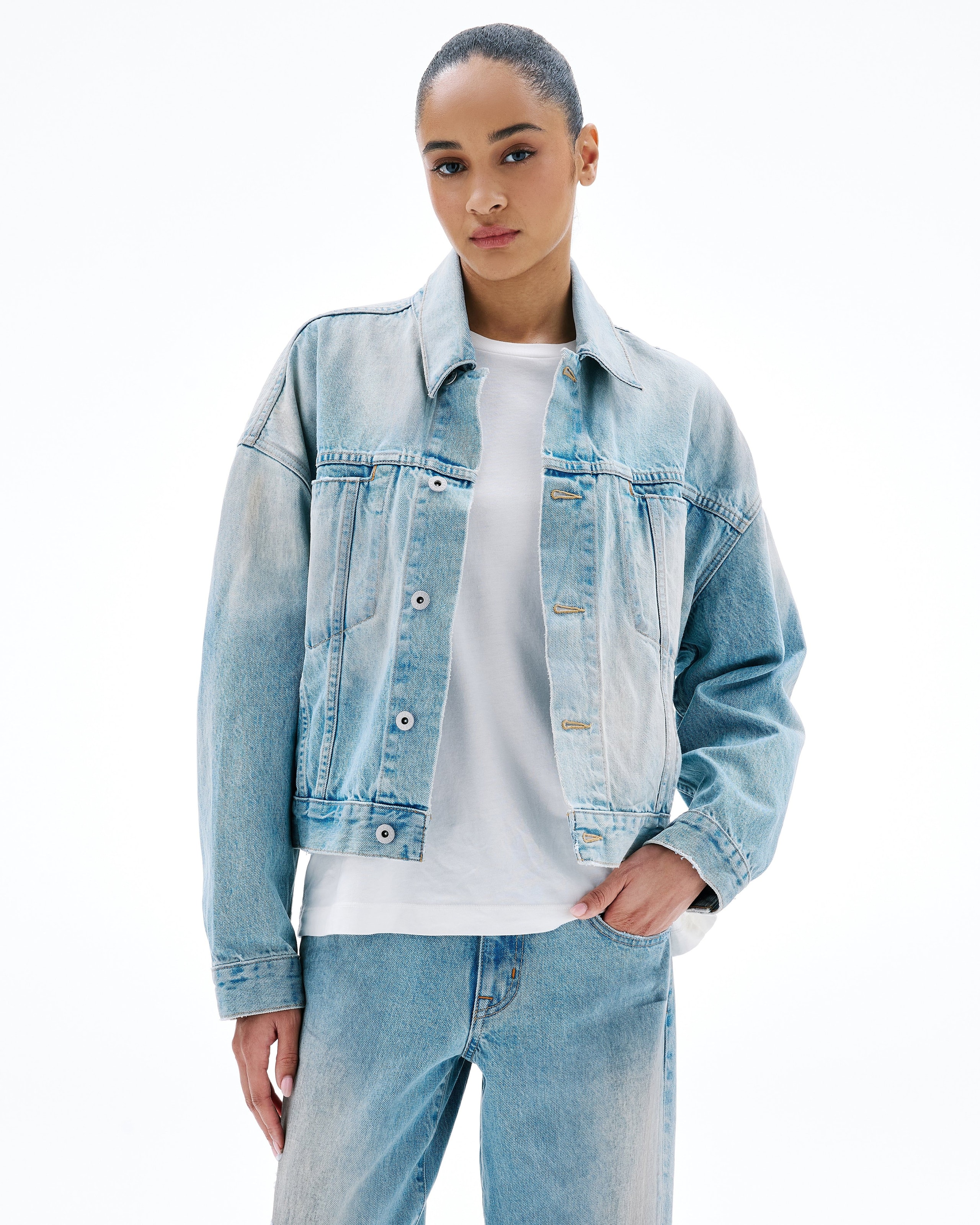 Boston Trucker is a modern take on the classic trucker jacket featured in a oversized silhouette. Crafted from 100% cotton fabric, designed with front pocket detail and drop shoulder finished with button closure.