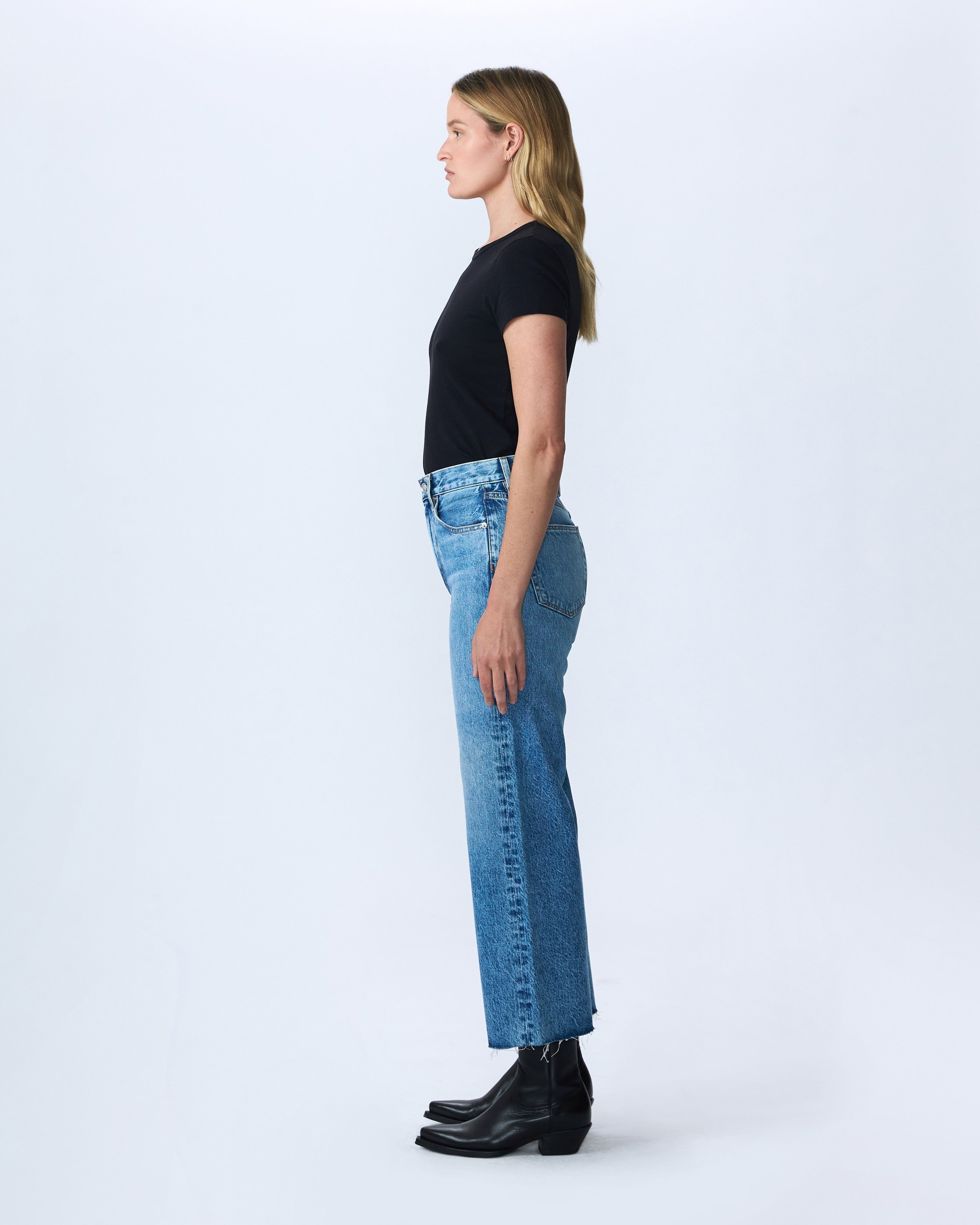 Grace is a SLVRLAKE signature style, offered in a cropped length designed to elongate the leg. Featuring a high-rise waist and wide-leg silhouette, it fits close through the waist and hip before flowing through the leg, finished with a raw hem. An essential style offering versatile styling options.