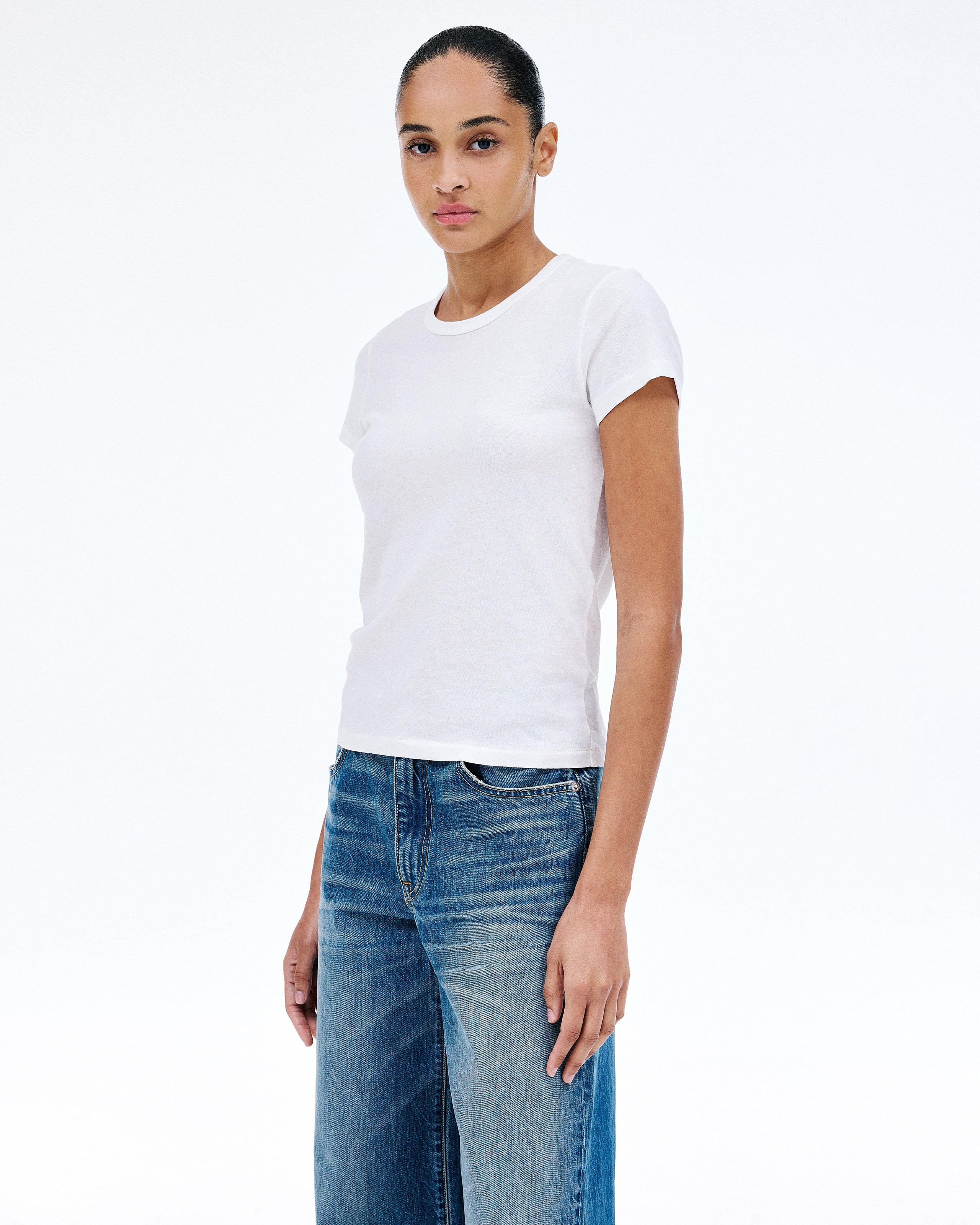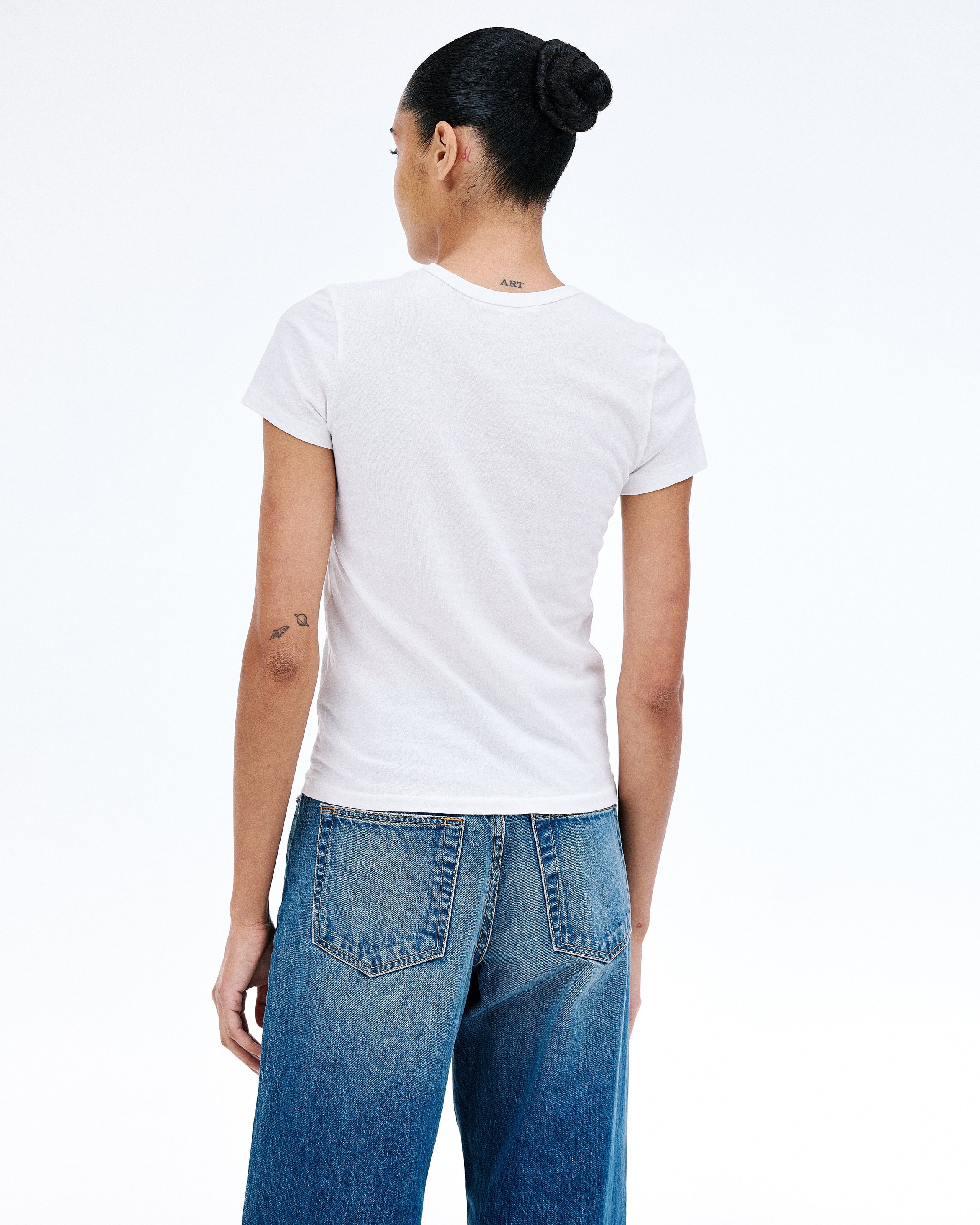 Crafted from a light weight open-end fabric for an authentic vintage look and feel. This modern silhouette features a cap sleeve and fitted silhoutte.
